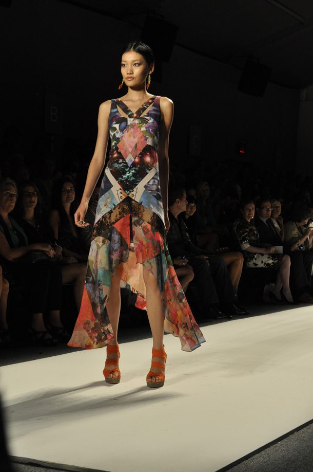 A model sporting rainbow hair—neon orange, green, blue, pink and turquoise—graced the runway in a dress with a waterfall hem made of both pastel and bright florals, which were separated at the waist by a pixilated barcode-like pattern. Over the dress was a leather biker jacket, complete with slight fringe falling from the zippers. The look verged on a visual overload.