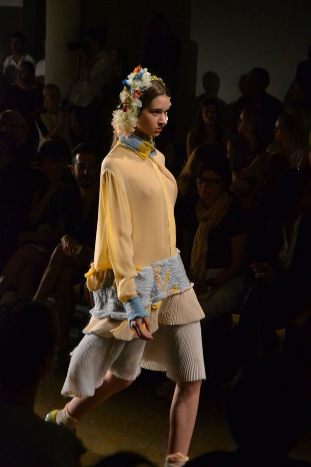 Menswear inspired pieces was very evident in both Jun Juyeon Hong and Qianyan Zhao’s collections. Hong’s pieces were baggy and the fabric was heavy. On the other hand, Zhao’s pieces were uniformly black and meticulously tailored. Although Zhao’s collection was sharp and constructed perfectly it was quickly overpowered. Sinéad Lawlor’s print was the most memorable of the show. Button print in bright orange, pink, and blue along with some lace and rhinestone detail composed the simple tunics, skinny leg pants, and simple jackets.