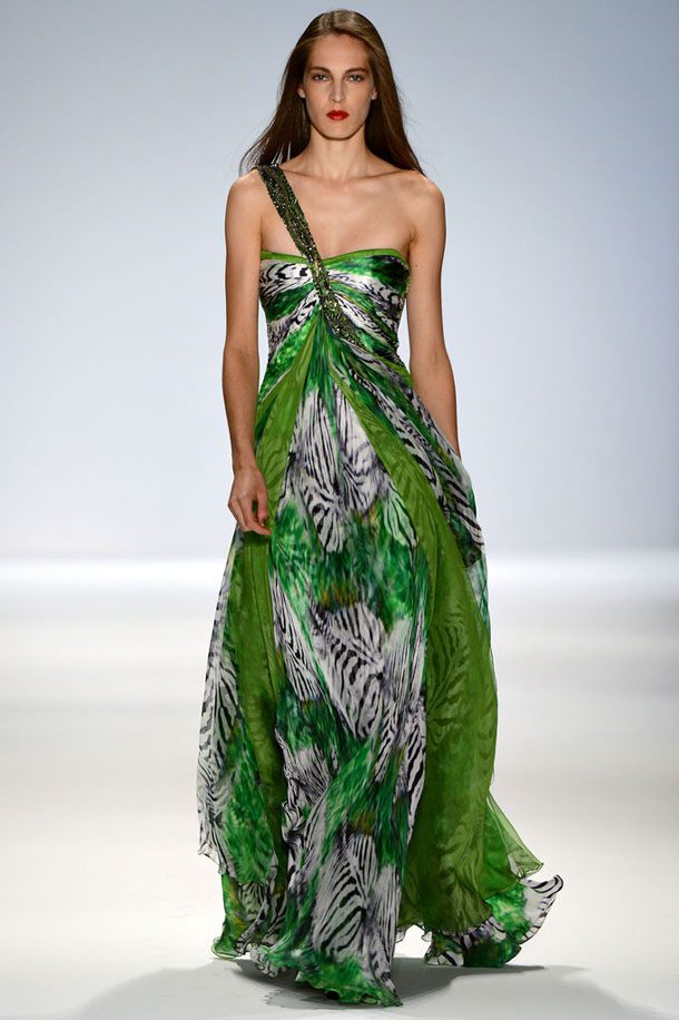 Following this look came a short black dress that featured two more prominent trends in the show – fringe and epaulets. The rest of the show, which included dramatic gowns and practical separates, featured many more vivid animal prints in airy fabrics, as well as several looks that incorporated black lace and fringe details that evoked the flapper-style of the 1920’s. The crowd emitted a gasp over a silk organza gown that brilliantly showcased both leopard print and black embroidery.