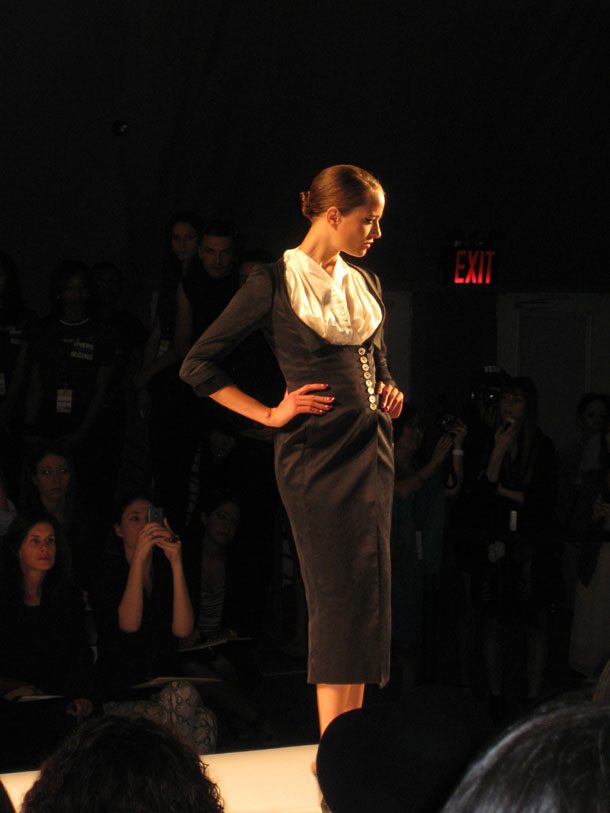 While black, white, grey and brown pieces dominated the collection, there was an occasional pop of color, even if only in the lipstick, nails, or shoes. The collection clearly had a little bit of everything: business-chic buttoned down dresses and casual shorts with cape tops, to glamorous garb—some of which included metallics—fit for a walk on the red carpet. One of the more playful dresses had a tight-fitted, black bodice and a white, flowy bottom with a splash of red. A sleek, yet somewhat sporty, look included tight-fitted black Capri pants and a peplum top.