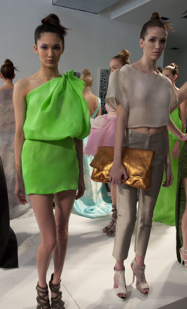 The standout of the Abigail Stewart Spring/Summer 2013 collection were the fabrics and colors. Using bright neon green, shades of pink and light blue, anchored by light grey and a few metallic bags, the color palate evoked spring and summer. The digitally printed dupioni organza, mikado and silk jersey were beautiful fabrics based on Pauly’s paintings, that in some instances looked water dripped, while others had flower petal details. The mix of smooth silks with mohair and leather presented contrast and detail. The product of Abigail Stewart’s collaboration with Justin Pauly was a tremendous result of visual art meeting conceptual fashion.