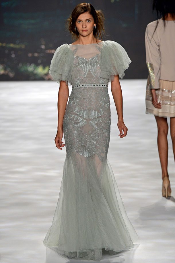 Badgley Mischka shines most when their gowns strike a balance between overdone and blank canvases in chiffon. The most notable designs were enhanced by sparkle and shine, not overshadowed by it. Some gowns – the final coral organza, and an over embellished sheer chiffon number, appeared to overwork the delicate fabrics.