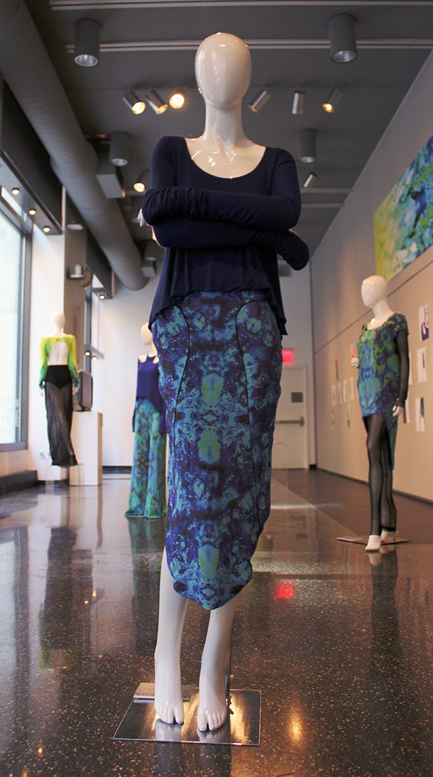 Complementing her original designs are around 50 fashion illustrations and her collaborative fashion film “Earth + Beyond.” The film emphasizes the freedom and movement in each garment with upbeat music and modern dance. Models wearing Kathleen’s designs move freely to original music by Emily Maggiotto. Marissa Quimby, the star of the film, was also the choreographer. The film is the perfect accent to the collection and adds life and movement to an otherwise static exhibition.