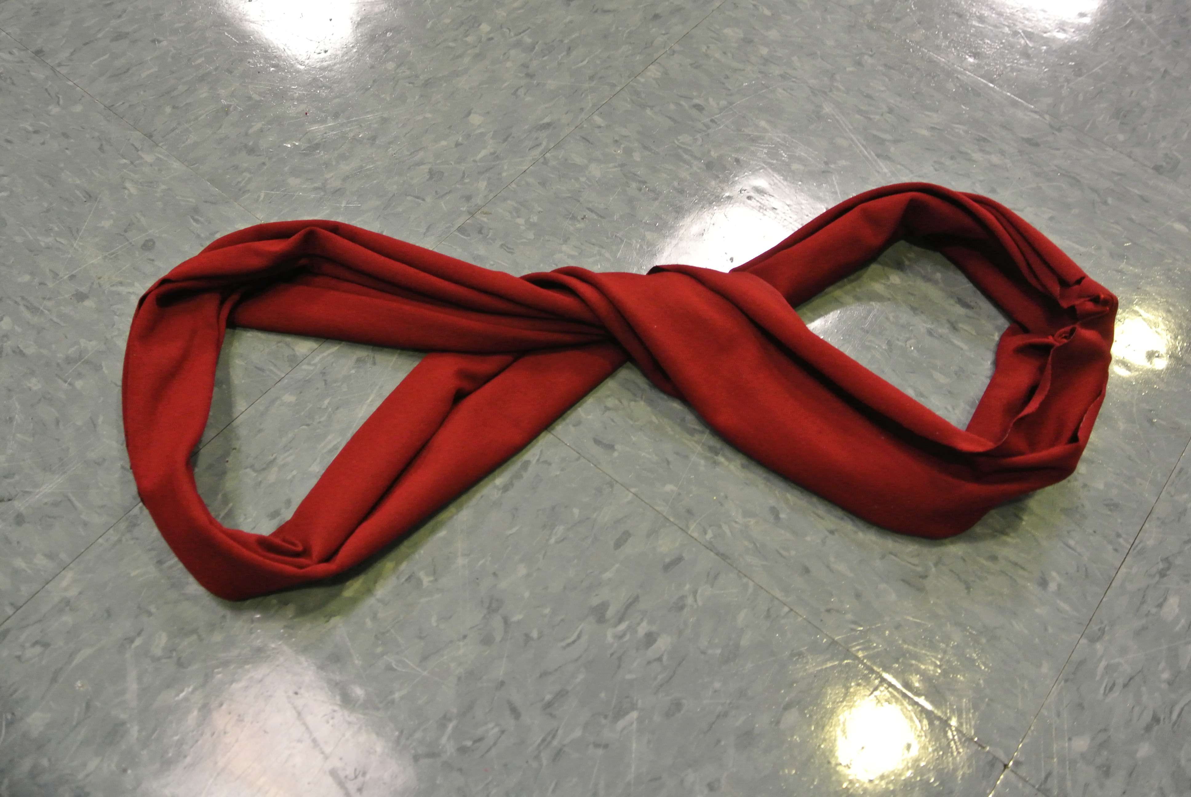 8. To get the shape, twist the circle of fabric so it resembles an infinity symbol. Then twist it again.