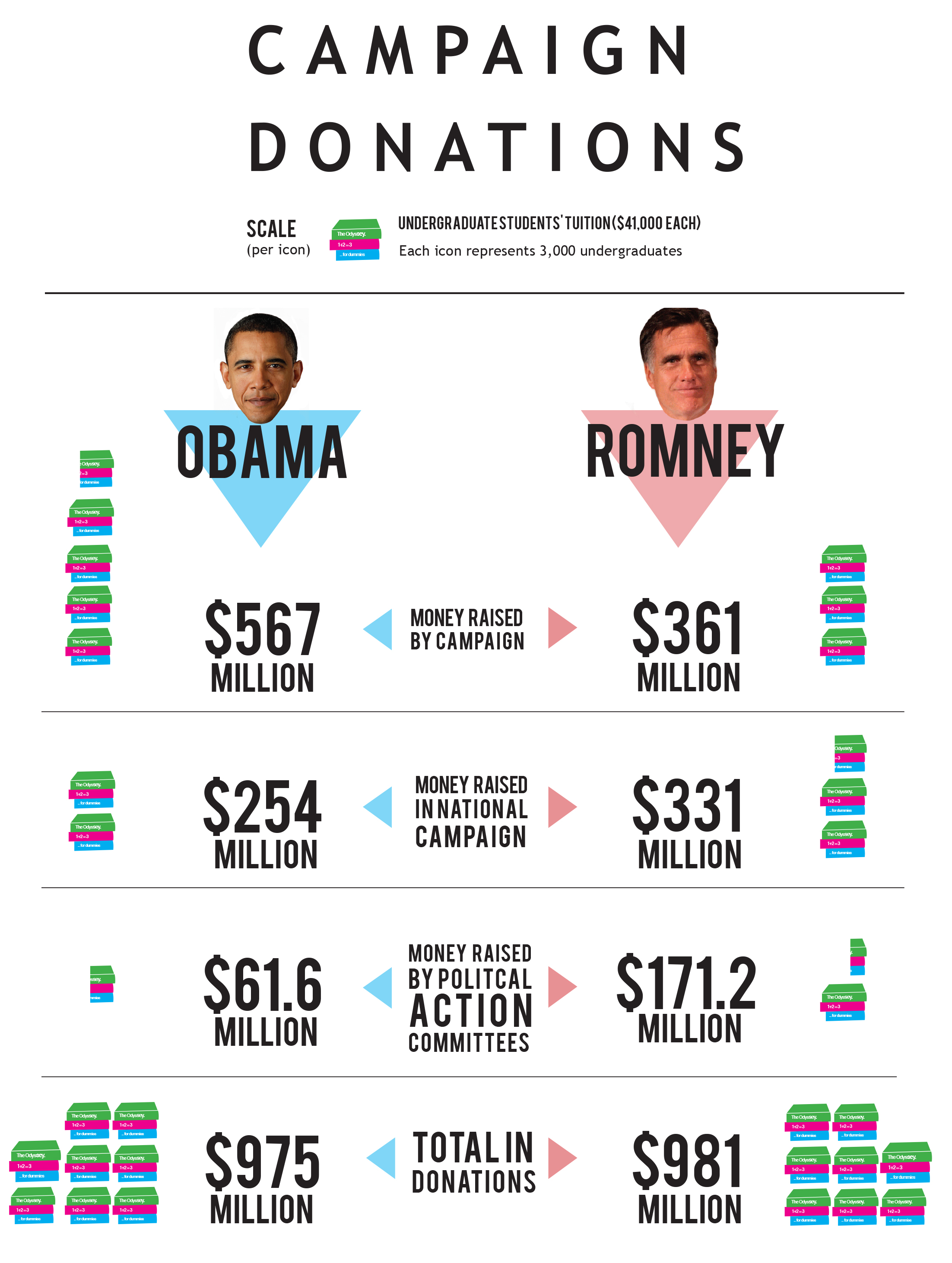 As the presidential campaign heads into its final week, one thing is already certain: raising money was not a problem for either of the two candidates. Together, Obama and Romney raised exorbitant amounts—reaching nearly $2 billion. To put that into context, WSN has modified the amounts of money raised to values NYU students can find relatable.
