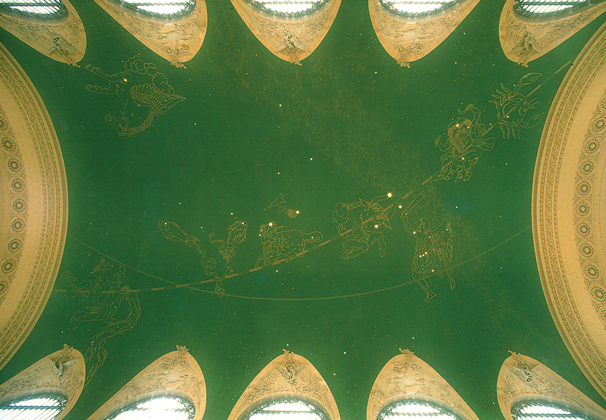 The Mirror Zodiac — The main concourse’s ceiling is a mural featuring 2,500 stars and depicting the Mediterranean sky as it appears in October. It is believed that Paul Helleu, the artist, painted the zodiac backwards to show how it would look from the perspective of the gods.