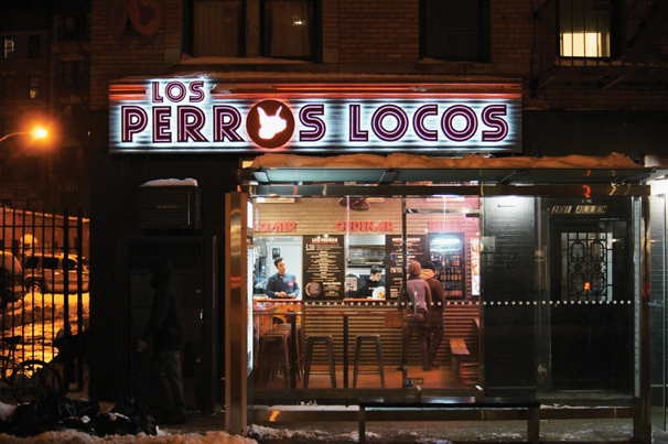 A recently opened, late-night eatery on the Lower East Side, Los Perros Locos is redefining our expectations of hot dogs and hamburgers. Customers who venture to this two-week-old restaurant can sample a variety of Colombian street food-themed items, from the El Niño Loco hot dog ($4.50), topped with Kraft macaroni and cheese and crushed Fritos, to the El Perro Perdido ($8), which is served in a deep-fried French Toast bun.