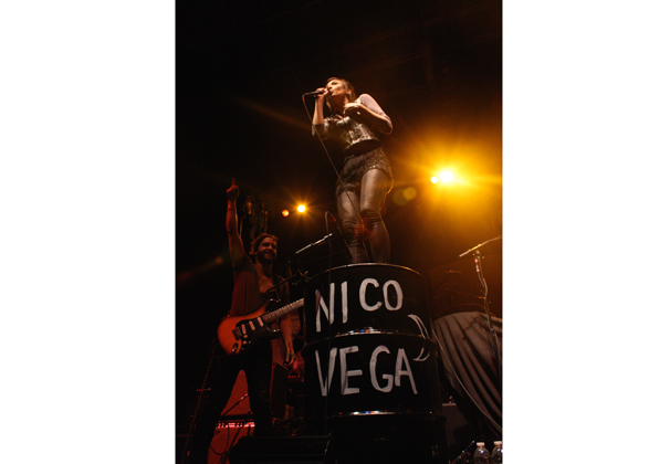 Nico Vega were incredibly energetic. Lead singer Aja Volkman climbed all over the stage, a vibrancy highlighted when she jumped off an empty oil drum with the band’s name on it. Their short set was the perfect way to start off the night and keep anticipation high.