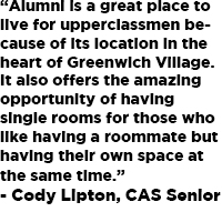 However, Alumni is plagued with a lack of community involvement, as many of its residents don’t care for community-building programs or group events. For those who are interested, programs include free trips to the Metropolitan Museum of Art, spaghetti dinners and free study snacks during midterms and finals. But besides the lack of spirit, Alumni’s location, facilities and single bedrooms make the residence hall a solid option for next year’s housing selection process.