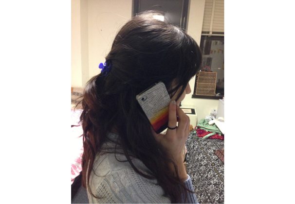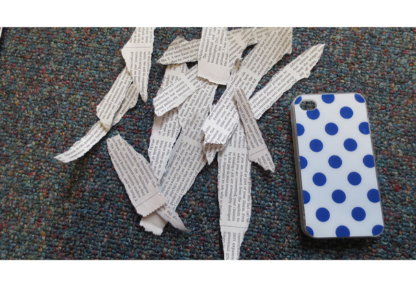 2. Cut a hole out of a newspaper strip to accommodate the case’s camera. Apply a small layer of glue, lay the strip flat in the desired position and gently brush another layer of glue on top of the strip. Get rid of bubbles and folds before the glue dries.