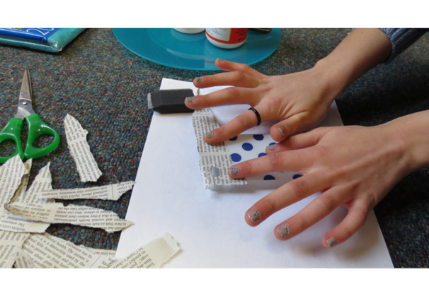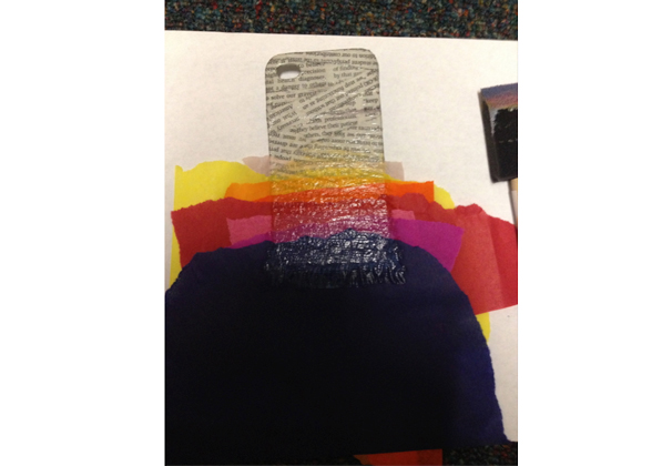 6. To add color, layer sheets of colored tissue paper on top of the case. Depending on style, rip or cut the pieces of tissue paper, arrange them on the cover and begin gluing. Be especially gentle with the glue because tissue paper is delicate and tears easily.