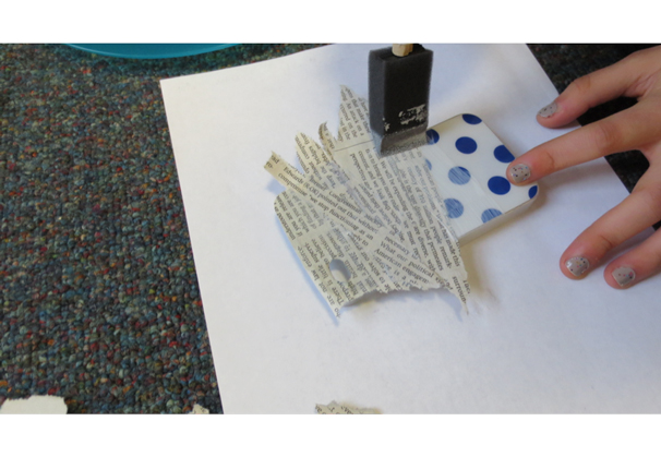 3. Continue adding strips of newspaper until the surface is completely covered. Add a thin layer of glue both under and over every strip to begin the decoupage process and ensure each strip is secured to the cover.