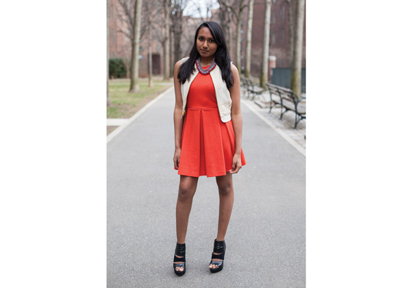 Night: Go for a more colorful vest, like red or purple. This will give your outfit a fun pop of color. Under the vest, wear a simple A-line dress in a neutral color. Add on a chunky necklace and some three-inch pumps to give your look an edge against the sweet feminine side.