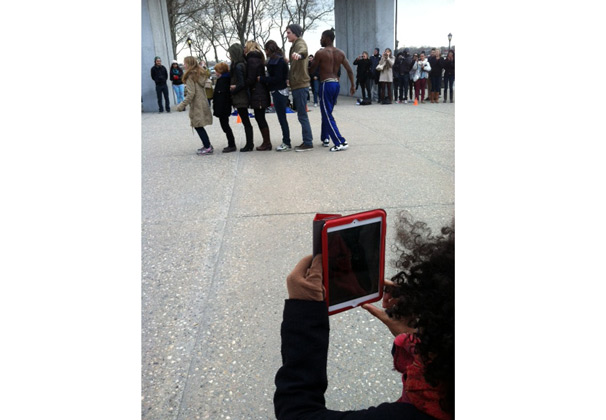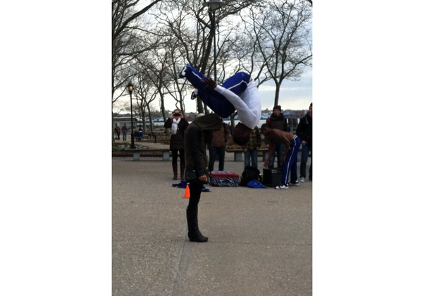 Following a chattery group of college kids from Austin, Texas, I made my way to a large crowd of laughing and cheering people that could only be surrounding street performers. I admired their timing. With no Statue of Liberty to tempt the wallets of out-of-towners, what could tourists really do at the base of the island besides take pictures of the squirrels? (Which, I might add, I saw several different people doing. Seriously? They are only a few small features away from being rats. Also, if you’re going to take so many pictures of them, they definitely deserve a tip, just like the guy spray-painted silver in Times Square.)