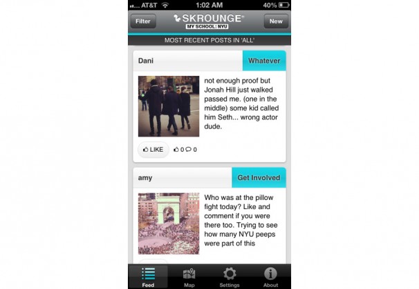 One of Skrounge’s best features is that a student’s location is available along with his or her posts, allowing students and viewers to meet and discover new restaurants, theaters, party venues and study locations.