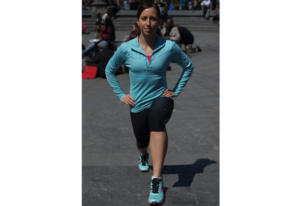 Place your right foot two steps higher than your left foot on a section of open steps at the central fountain. Drop your left knee toward the ground as you lower into a lunge position. As you lunge, rotate your shoulders to the right as far as you can with your hands on your hips. Return to the starting position.
