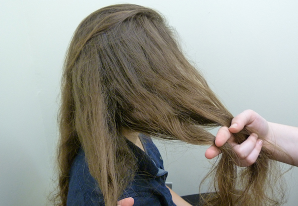 1.) Start by parting dry hair straight down the middle of your head. Divide hair so a thick section falls to the right of your head. Sweep the rest of your hair behind your head and across your left shoulder to keep it out of the way.