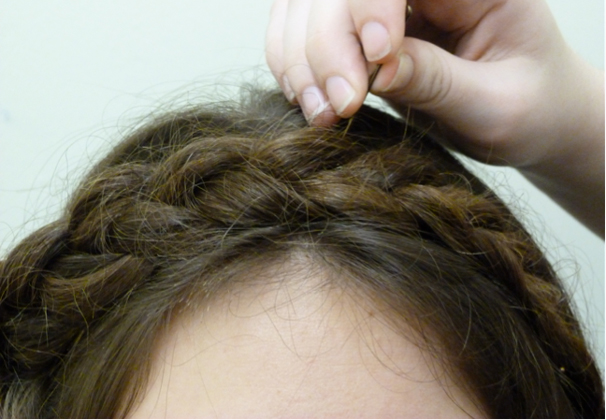 6.) If needed, pin the rest of the crown braid in place along your scalp with bobby pins.