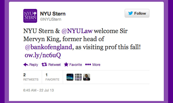 - High profile prof: The former Bank of England Chief is stepping down and crossing the Atlantic to teach at NYU Stern, starting this fall. Working in the economics department, Sir Mervyn King is known for his leadership during the 2008 financial crises.