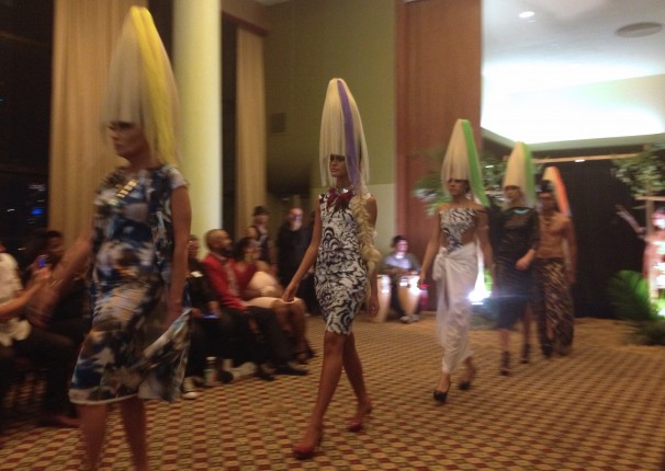 The clothes ranged from Wilma Flinstone-meets-The Lion King ensembles to more wearable, abstract interpretations of rainforest prints and colors. Beginning with zebra-printed dresses, meandering into island skyline-print blazers, tropical color-blocked full-length jersey gowns, and finishing with lingerie-inspired lace two-pieces, Alicea displayed a wide array of avant-garde streetwear. Standouts included bras and epaulets made of feathers and island-collage printed suit sets.