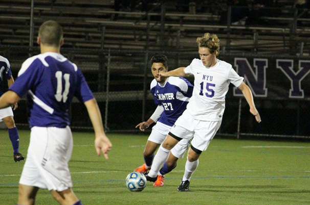 High pressure and quick passes set the scene for the attack in the first half of the NYU men’s soccer match against city rival Hunter College Hawks on Wednesday night. Sophomore defender Robin Smith and senior midfielder Ian Cassell were a constant threat down the left side of the pitch as the Violets took it to the Hawks offensively.