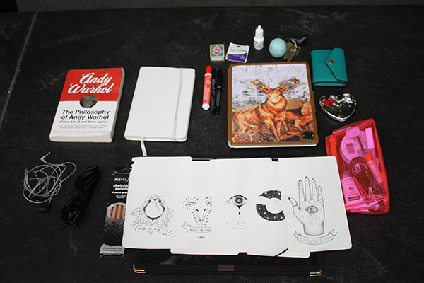 Sutnick always has creative essentials on the go — sketching pencils, Prismacolor pens, a white leather-bound sketchbook and a portfolio to store finished drawings. These drawings encapsulate Sutnick’s artistic style — old school tattoo-inspired line drawings accompanying witty captions like “Psychics R Psycho.”