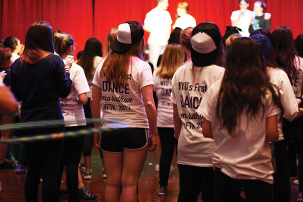 An estimated 1,400 members of NYU Greek Life joined together in the Kimmel Center for University Life for the first NYU Dance Marathon to benefit the Andrew McDonough B+ Foundation, an organization that raises funds to fight childhood cancer.