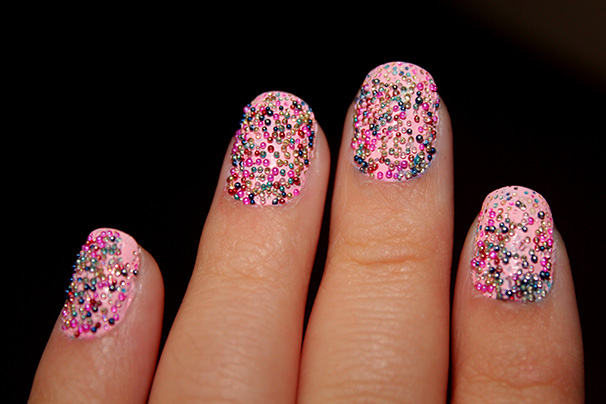 If you’re looking for more texture, try a caviar manicure. Caviar nails, which involve embellishments with colorful microbeads, add a lot of punch to a manicure but can be difficult to maintain. This look was first seen at the Cushnie et Ochs Fall 2011 show, which presented all-black caviar nails designed by Ciaté. The same nail brand sells a kit, complete with a mini funnel, tray and corresponding polish and beads. However, these kits cost up to $25. Instead, the microbeads can be found at a crafts store or online and can easily be applied. Add a thick layer of nail polish and allow the nails to dry for about 10 seconds or until the polish is tacky. Then, carefully pour the microbeads onto each nail, using a cup or tray to collect falling beads. Press the beads into the nails and, after the polish has dried, apply a clear topcoat. Though simple, this look works best for special events or short-term use because the beads are prone to falling off.