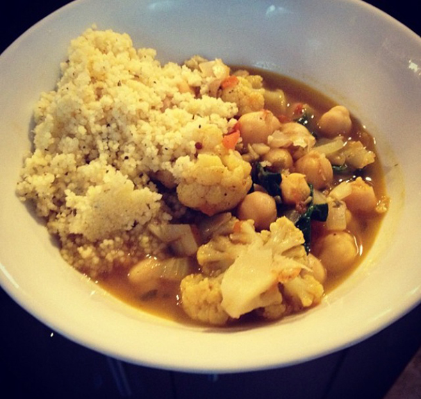 4. Add the vegetable broth, chickpeas and cauliflower. Simmer until cauliflower is tender (around 15 to 20 minutes). Add salt to taste.
