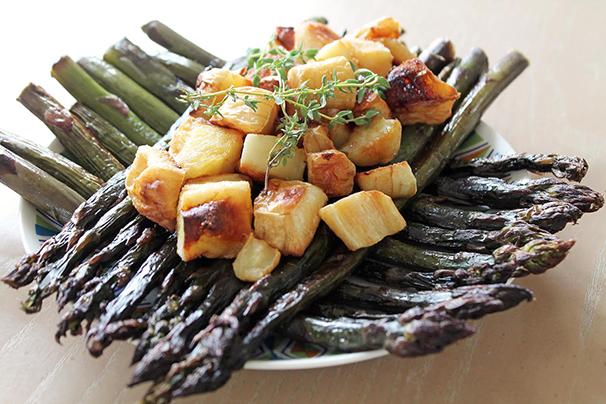 Stop at a local grower’s booth and you will find bunches of fresh asparagus stalks for a steal. You might also notice a white, carrot-like vegetable on display. The parsnip is a root vegetable known for its creamy texture and sweet taste. While these cousins of the carrot are typically grown in the fall, they have an even sweeter flavor in the spring after the winter frost has converted their starch to sugar. Unlike carrots, parsnips must be cooked before they can be enjoyed. Roasting them along with asparagus adds a rustic quality that complements this light and tasty spring dish. Add one or two extra parsnips to make this a hearty meal, or simply share it with friends as a healthy side.