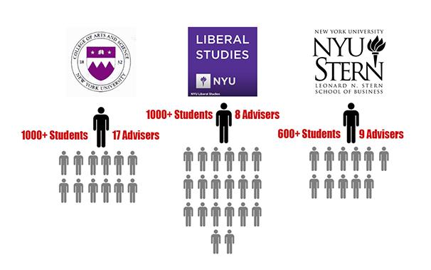 At the College of Arts and Science, there are 17 academic advisers for over 1,000 students per class; in the Liberal Studies Program, there are eight academic advisers for over 1,000 students per class; and at the Stern School of Business, there are nine academic advisers for approximately 600 students per class.