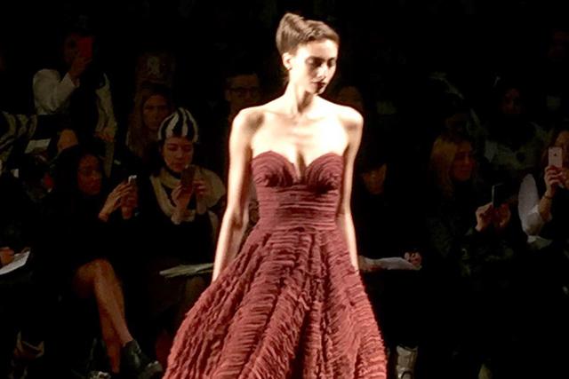 As the show progressed, garments in rich hues of burgundy and chartreuse brought rich color to the runway, and were reminiscent of Kahn’s Indian roots.