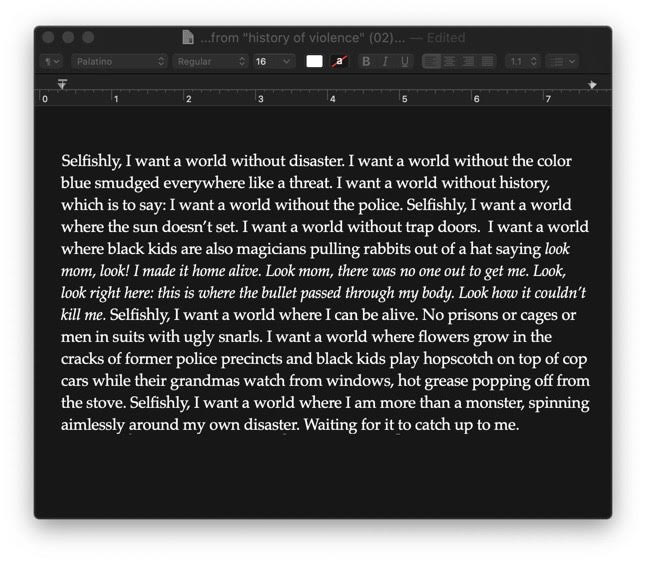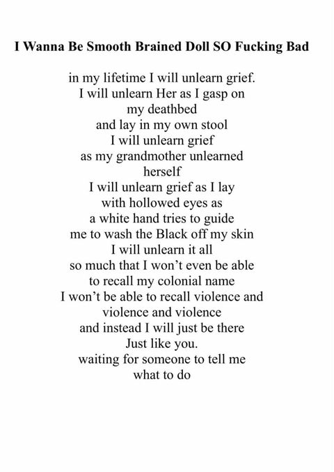 Decolonization begins not by writing against or separate from whiteness, but writing without it plaguing the mind. Decolonization is a radical unlearning process, something that begins within. Once the institutions fall, these implanted ideologies that hinder the furthering of Black art still remain. We have no other choice but to write past it.