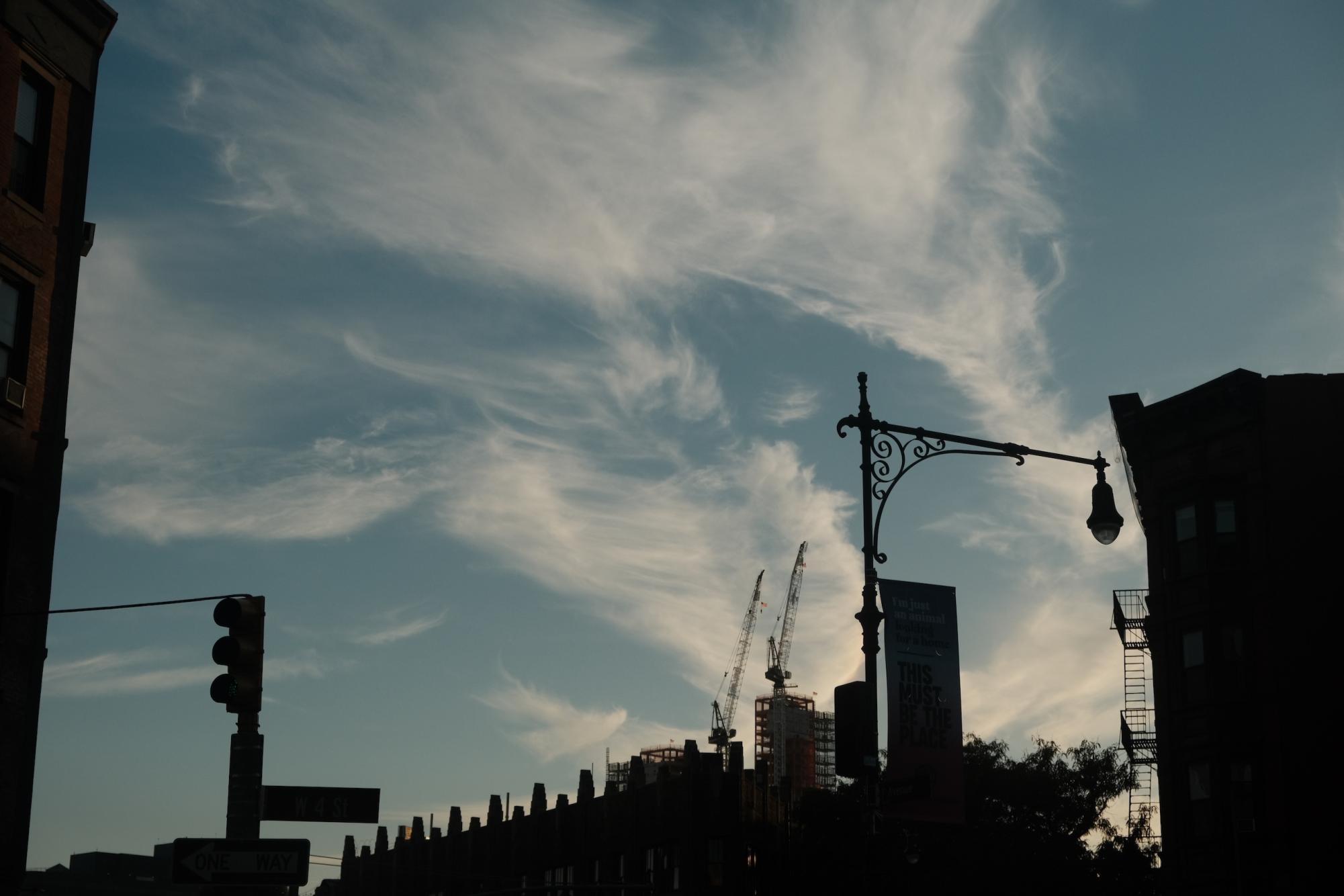 The dark outlines of buildings, cranes and lights intersect below wispy clouds.