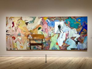 Finally, the “Show of Force” section tackles the political turmoil of the decade, showcasing artists’ reactions to violence in the United States and abroad. Peter Saul’s gigantic “Saigon” painting presents a neon hellish dreamscape in protest of the Vietnam War, relying on “ugly stereotypes of both Vietnamese women and American soldiers.” Most disturbingly, Saul paints cartoonish, bloody women being tied up and attacked by monsters with googly eyes. In neon block letters to the bottom left of the painting is the sentence “WHITE BOYS TORTURING AND RAPING THE PEOPLE OF SAIGON.”
