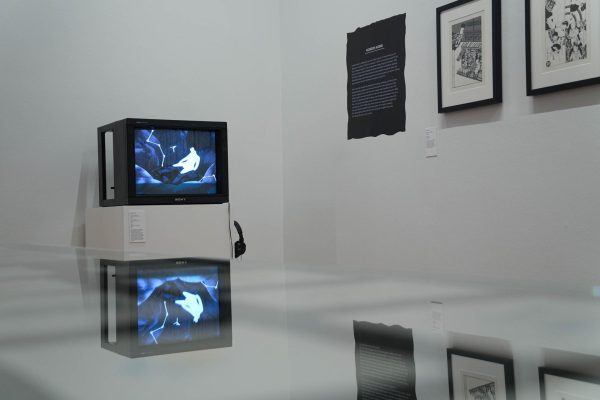 Alternatively, Akino’s works aim to bend reality. The second room of the exhibition displays a cathode ray tube television display that plays three hand-drawn animations, each running from four to six minutes. In “Ladybird’s Requiem,” Akino’s recurring character Eiko, a young girl, plays with ladybugs, sews buttons into her dress and dances in a dreamy landscape. Each shot becomes more unnerving as clones appear and the buttons come alive, merging with the ladybugs. Akino’s storytelling is nonsensical, disturbing and endlessly captivating.